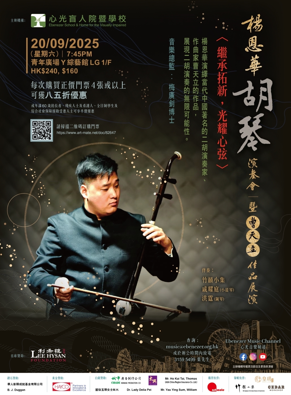 由心光盲人院暨學校主辦、香港作曲家聯會主席梅廣釗博士策劃、胡琴演奏家暨駐心光音樂家楊恩華主演,演繹當代中國著名二胡演奏家、作曲家曹天立的精彩作品,展現胡琴的獨特魅力與無限可能性。是次演出更邀請到專業中樂室內樂團竹韻小集、戚耀庭(小提琴)及洪霆(鋼琴)參與,融合多種樂器及樂隊合奏,帶來豐富多元的音樂享受,讓您沉浸於中樂的深厚韻味與動人旋律之中。